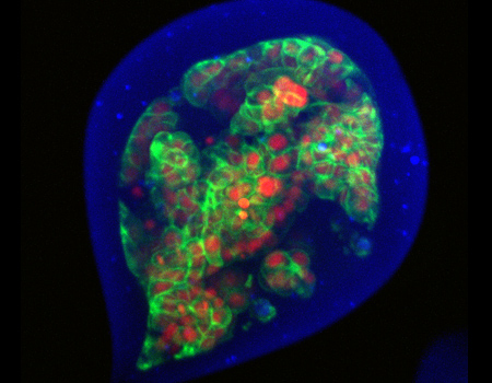 La microscopie confocale permet de visualiser des « tranches » très fines de cellule ou d’organismes vivants en discriminant leur altitude dans l’axe de visée. Cette méthode facilite les observations dynamiques et à haute résolution de cellules, particulièrement de cellules vivantes. La microscopie confocale ne peut se faire qu’à l’aide de lasers. Le faisceau balaye l’échantillon dans une configuration confocale et la fluorescence est détectée à travers une petite ouverture (pinhole), ce qui confère une très haute résolution, un plus grand contraste et un bruit réduit.